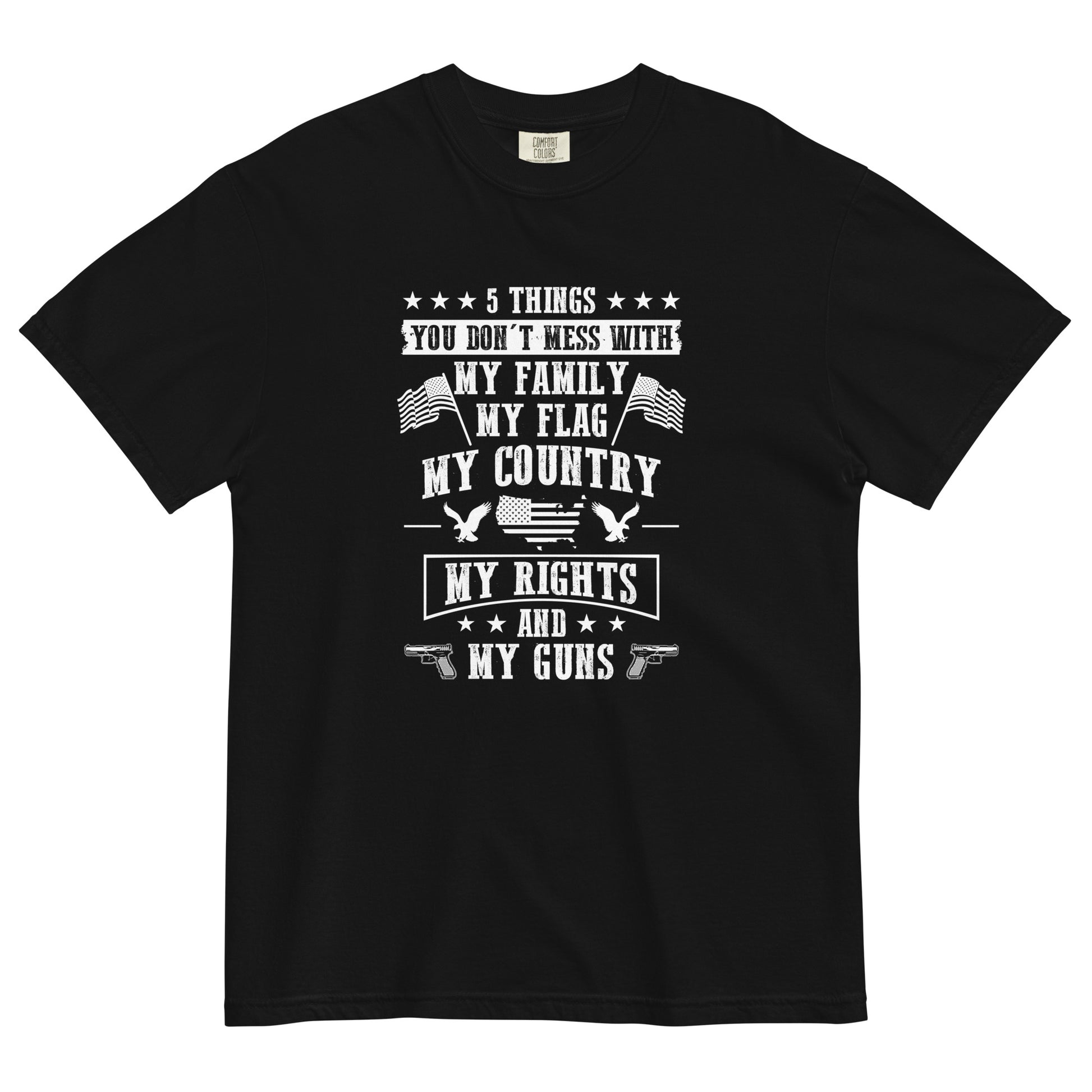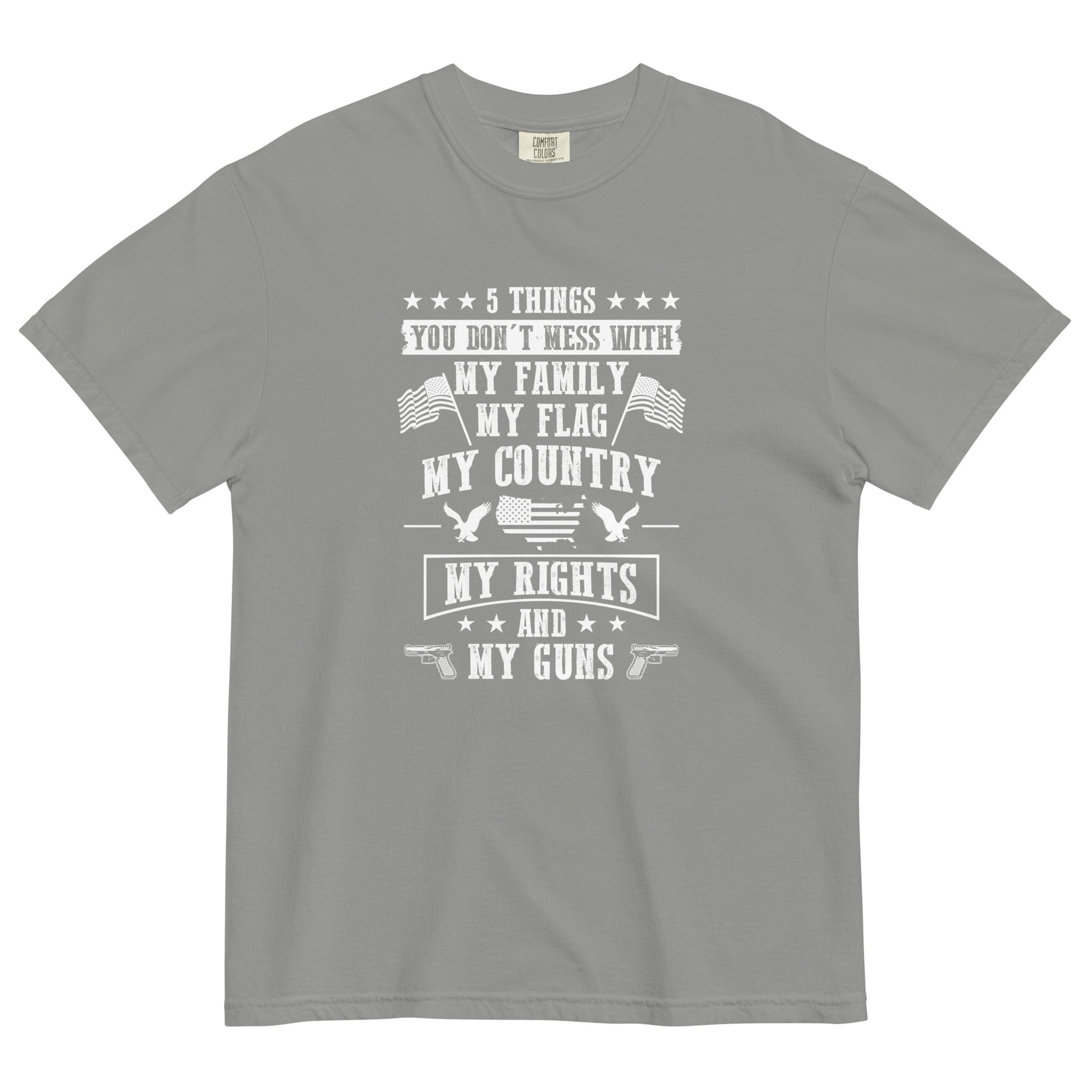Stand firm in your beliefs with our Defender's Creed Unisex Garment-Dyed Heavyweight Tee! Crafted from premium 100% ring-spun cotton, this tee represents the core values of American pride and resilience. Featuring the bold declaration '5 things u dont mess with: my fam, my flag, my country, my rights, my guns' alongside images of USA flags and majestic eagles, it's a powerful statement of unwavering loyalty. The relaxed fit and regular t-shirt style ensure comfort and versatility, making it an essential addition to any patriot's wardrobe. Elevate your style and defend your principles with our Defender's Creed tee!