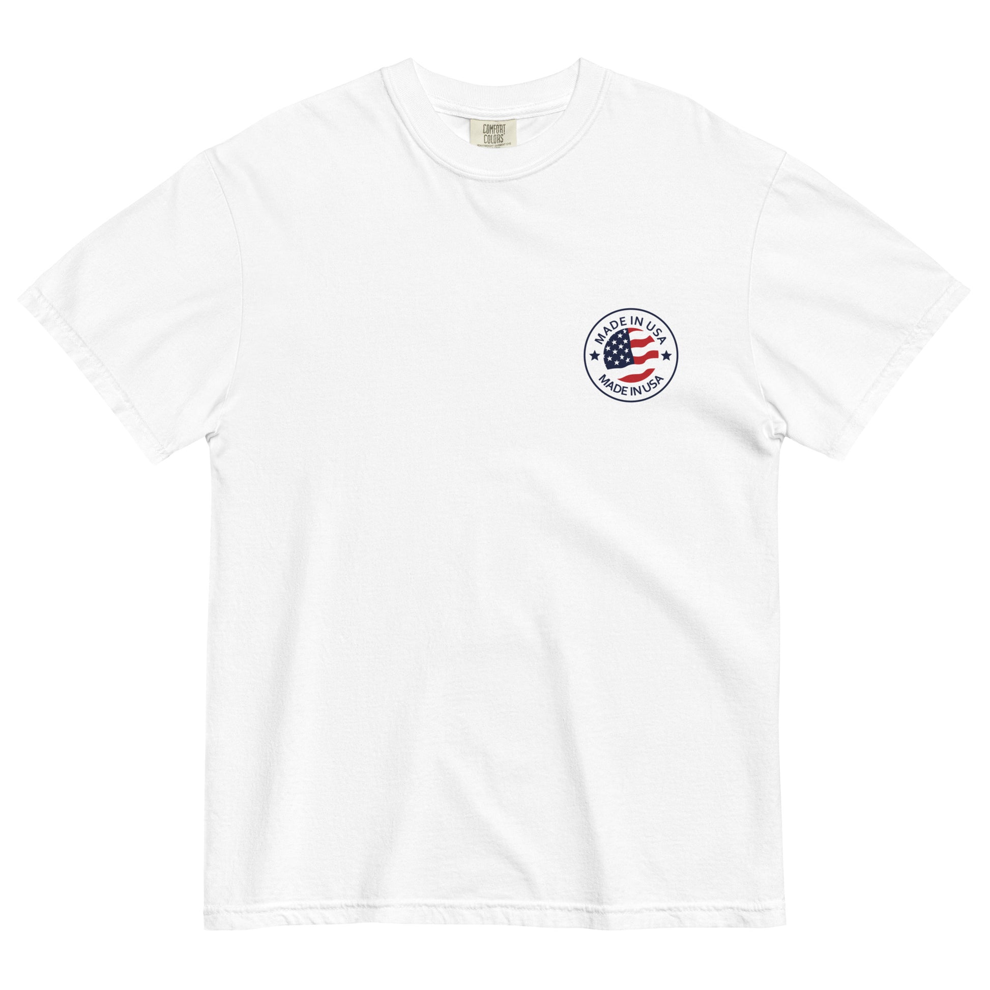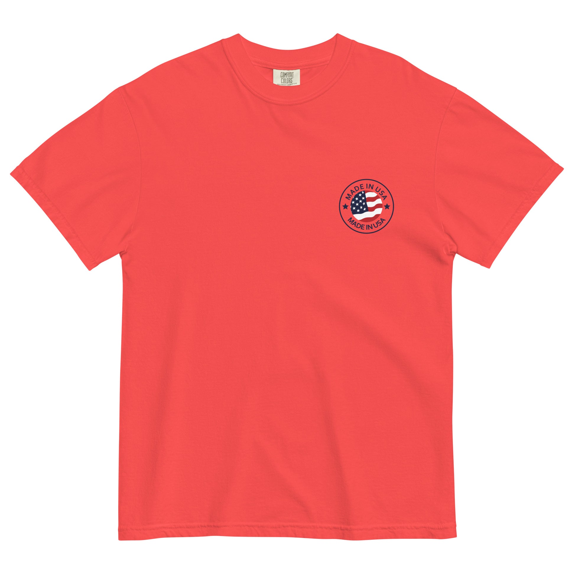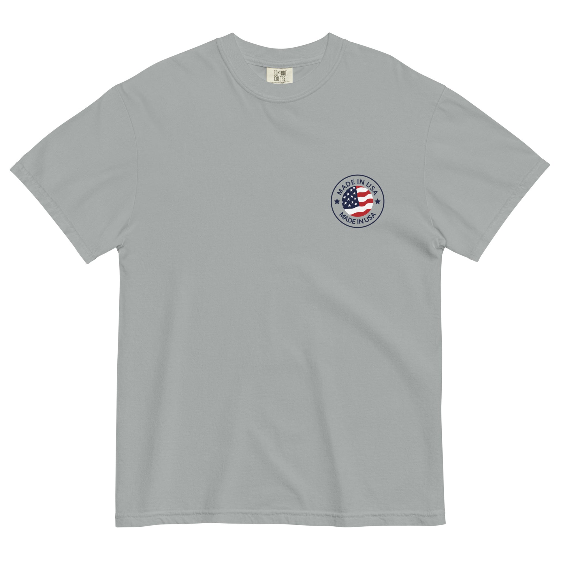 Discover the epitome of American craftsmanship with our Unisex Garment-Dyed Heavyweight T-shirt. Crafted from 100% ring-spun cotton, this tee offers a blend of durability, softness, and breathability that's second to none. With a small print of the USA flag and the proud declaration 'Made in USA,' this tee embodies patriotism and quality. The regular t-shirt style ensures versatility, effortlessly complementing any ensemble. Each tee is meticulously crafted on demand, reducing overproduction and ensuring that every purchase is a step towards sustainability. Embrace American pride and superior comfort with our Made in USA tee today!