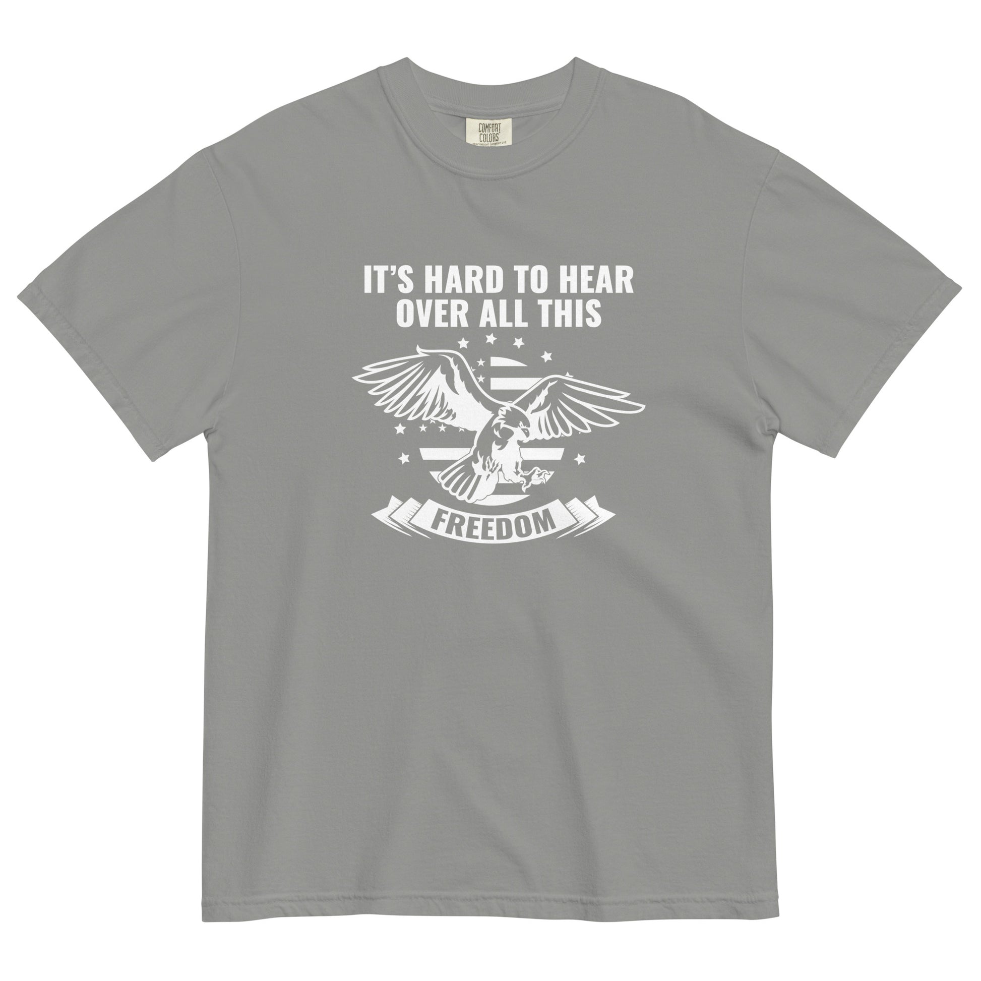 Embrace the call of freedom with our Wings of Liberty Unisex Garment-Dyed Heavyweight Tee! Crafted from premium 100% ring-spun cotton, this tee embodies the spirit of liberty and strength. Featuring the powerful message 'It's hard to hear after all freedom' alongside an iconic eagle image, it's a visual tribute to the resilience of the American spirit. The relaxed fit and regular t-shirt style ensure comfort and versatility, making it an essential addition to any patriot's wardrobe. Elevate your style and soar with our Wings of Liberty tee!